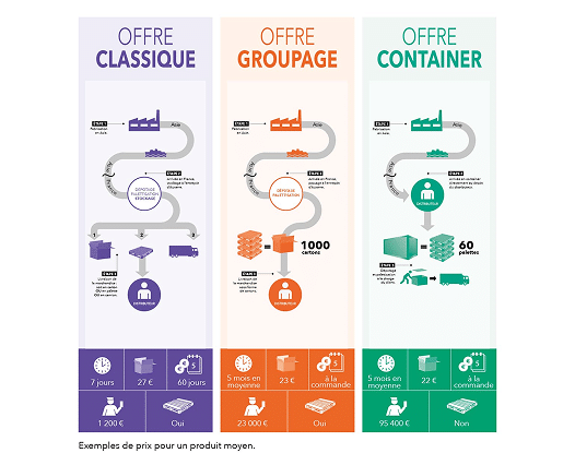 Vos réappros sont de 500 cartons minimum. Nous commandons ensemble un container à recevoir sous 4 mois. Vous recevez vos produits palettisés et filmés. Vous bénéficiez du prix d’achat d’un container.